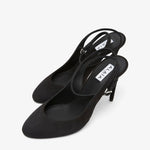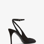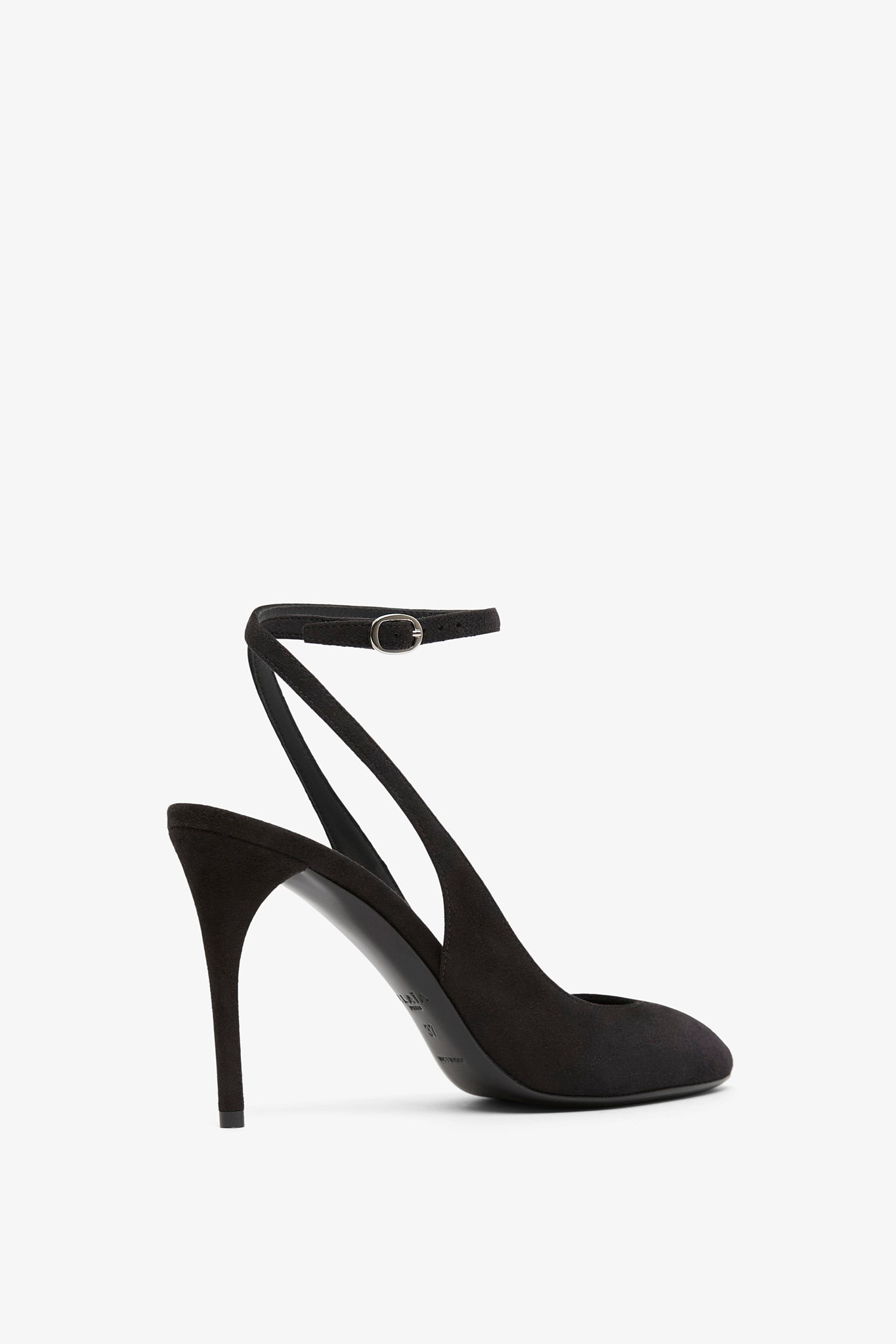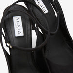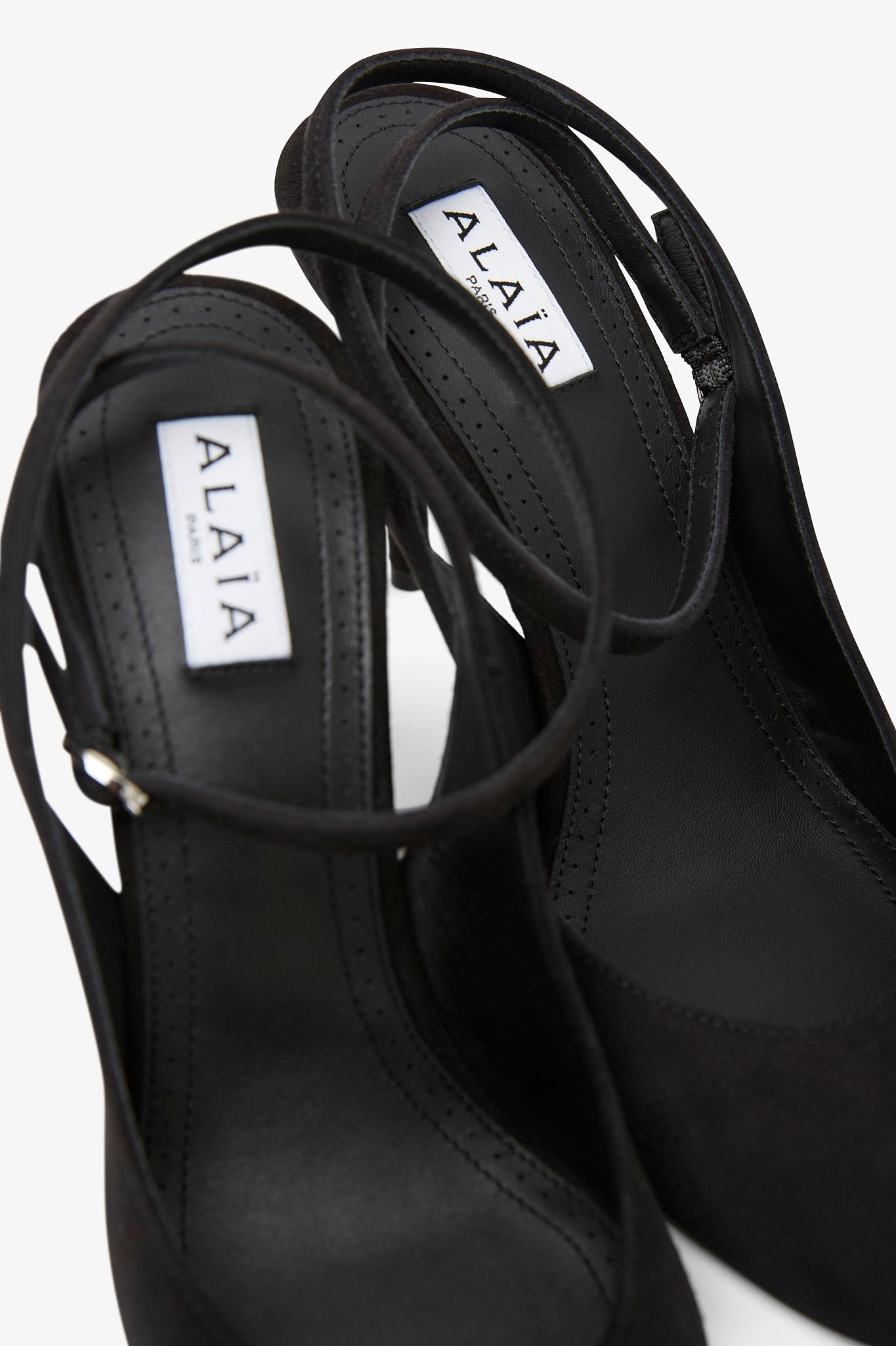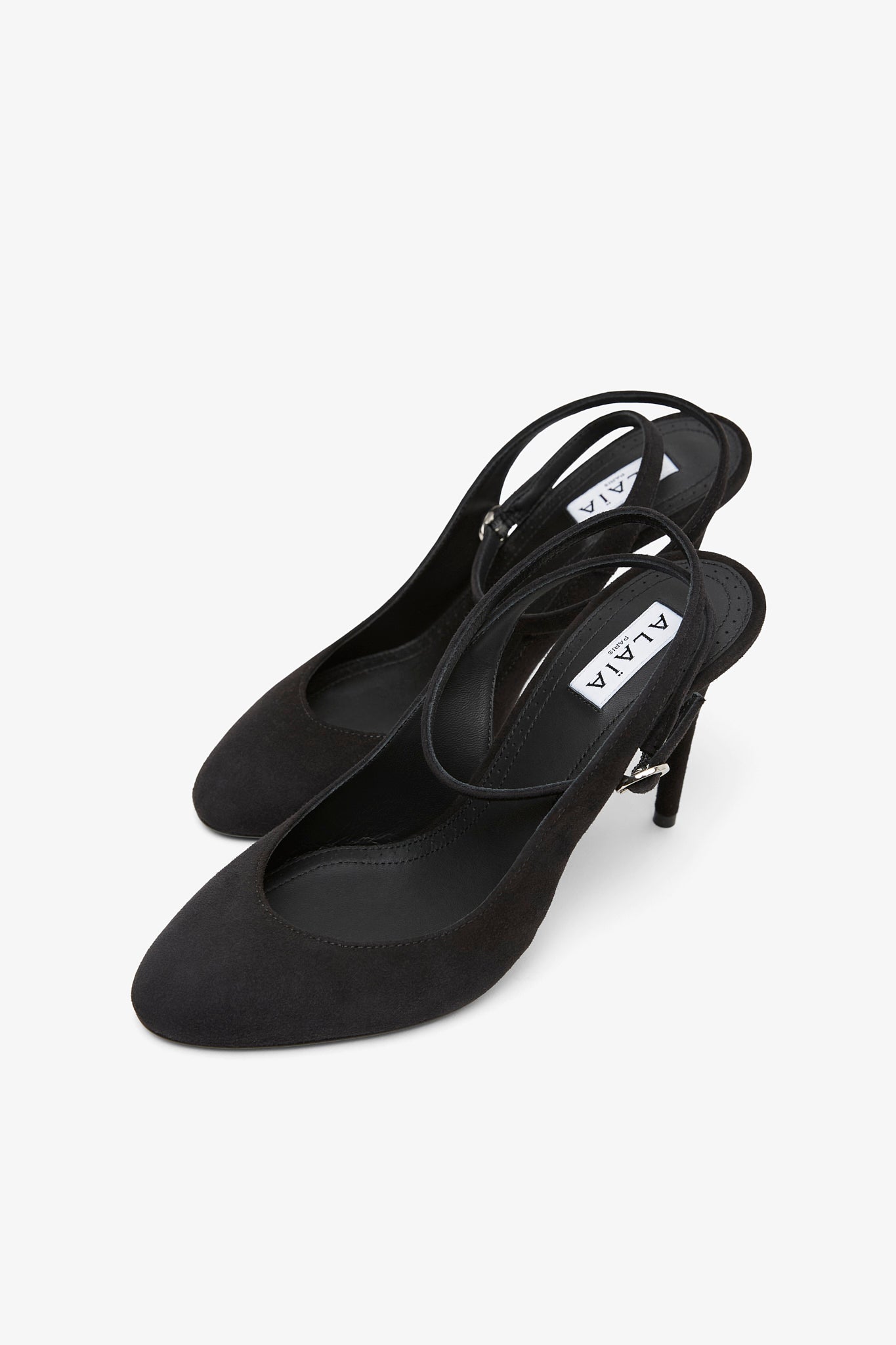 Black suede slingback pumps from Alaïa. The Decollete slingbacks are made of suede with a feminine low vamp, cross ankle straps and round-pointy toes. It is set on a 90mm heel.