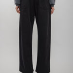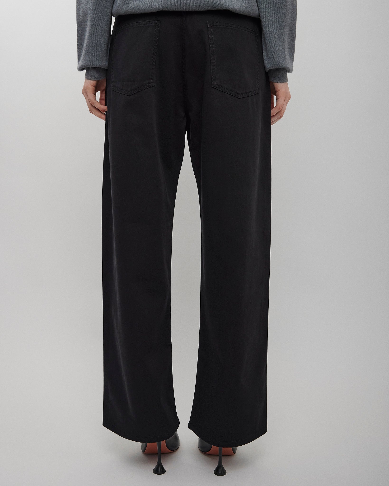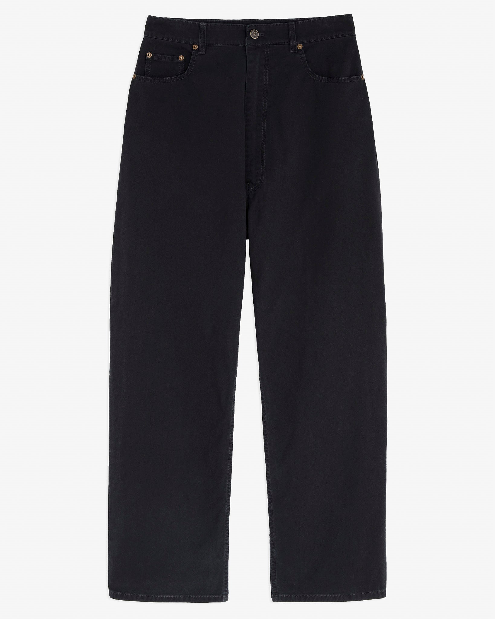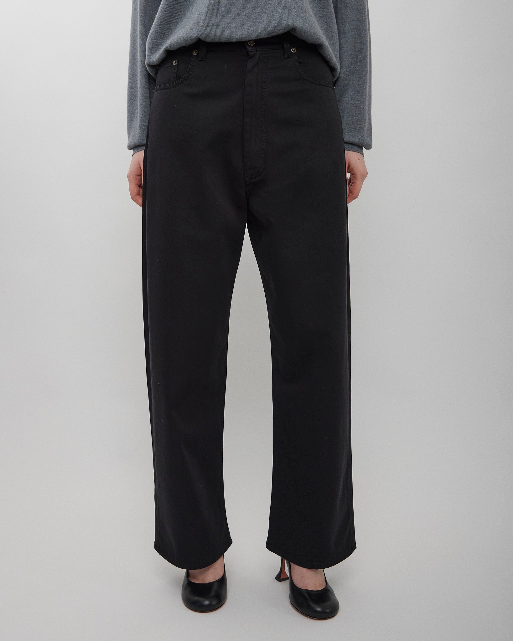 Low-waisted jeans in black cotton drill from Phoebe Philo. The trousers feature an exaggerated fit, a wide leg, ride low on the hips and pool on the floor.