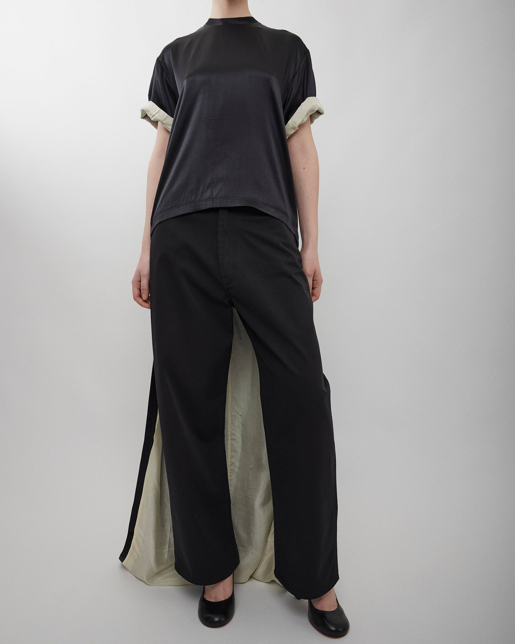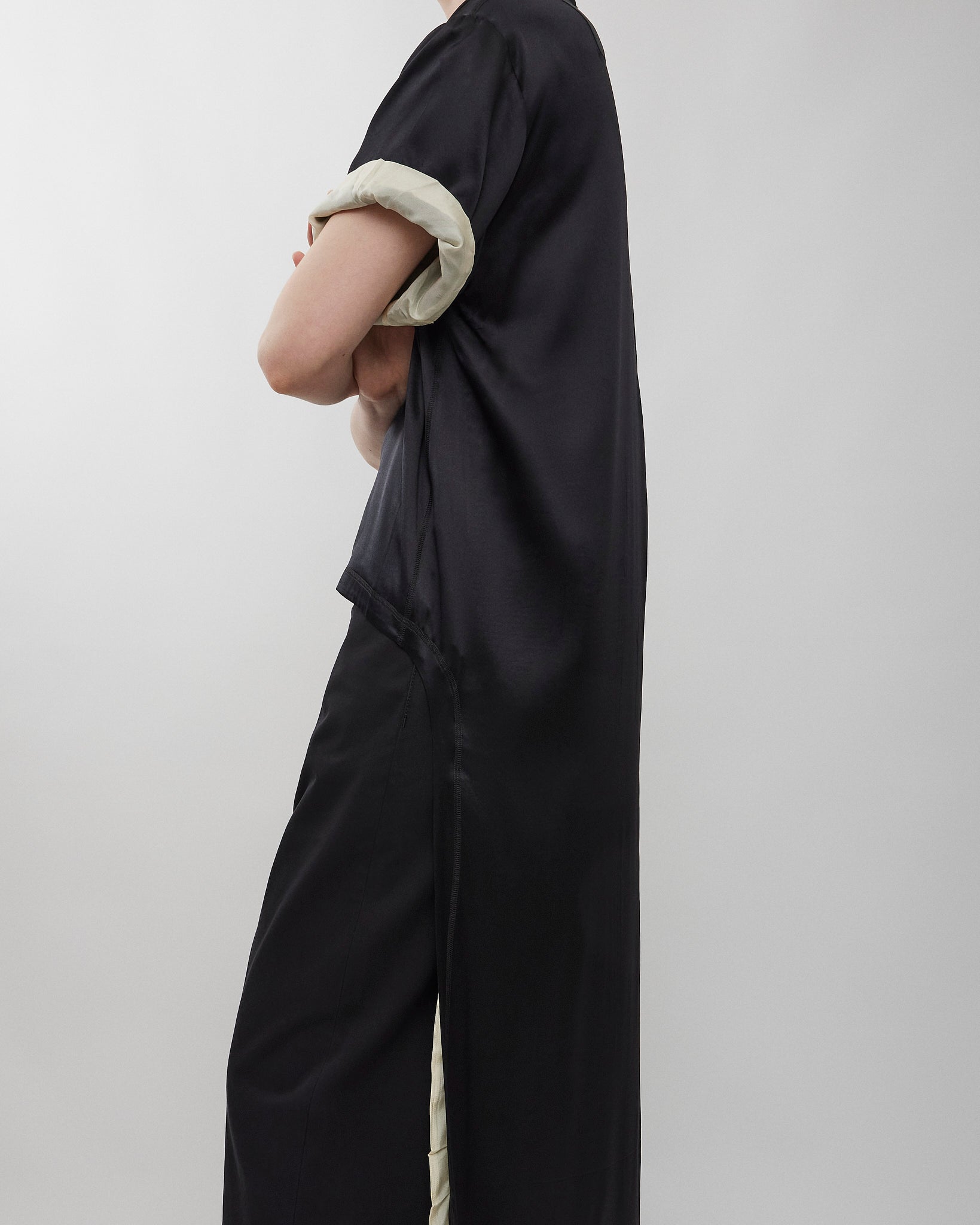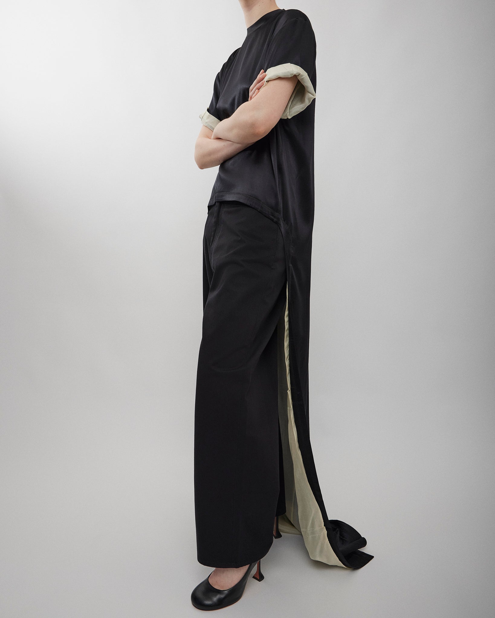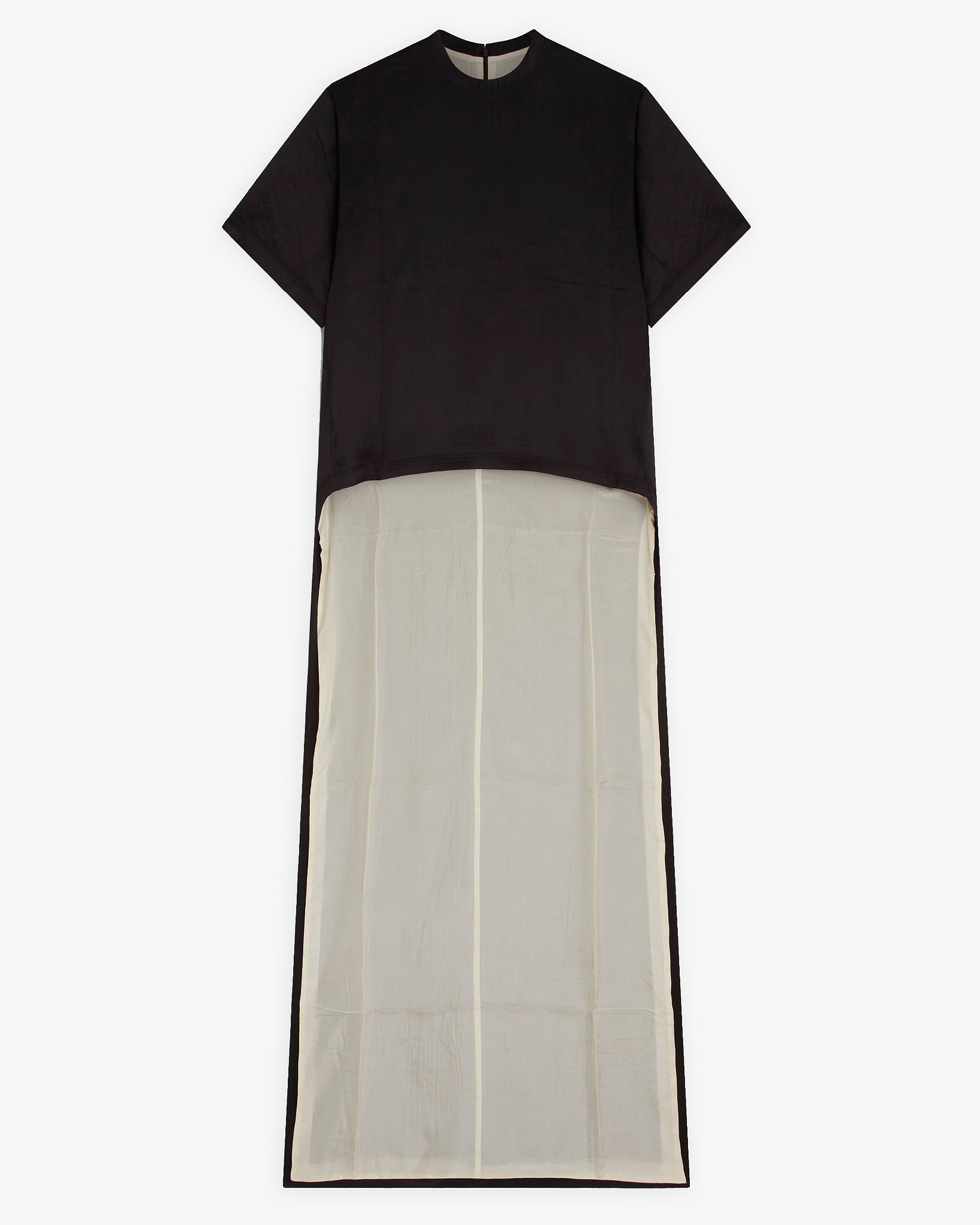 Graphic train top in black silk satin with vanilla washed habotai silk lining from Phoebe Philo. The boxy, crew neck T-shirt is extended at the back with a train, designed to fall just above the floor or scooped up and thrown over the arm. Invisible zip fastening at the base of the neck. The silk satin has a slight stretch.