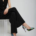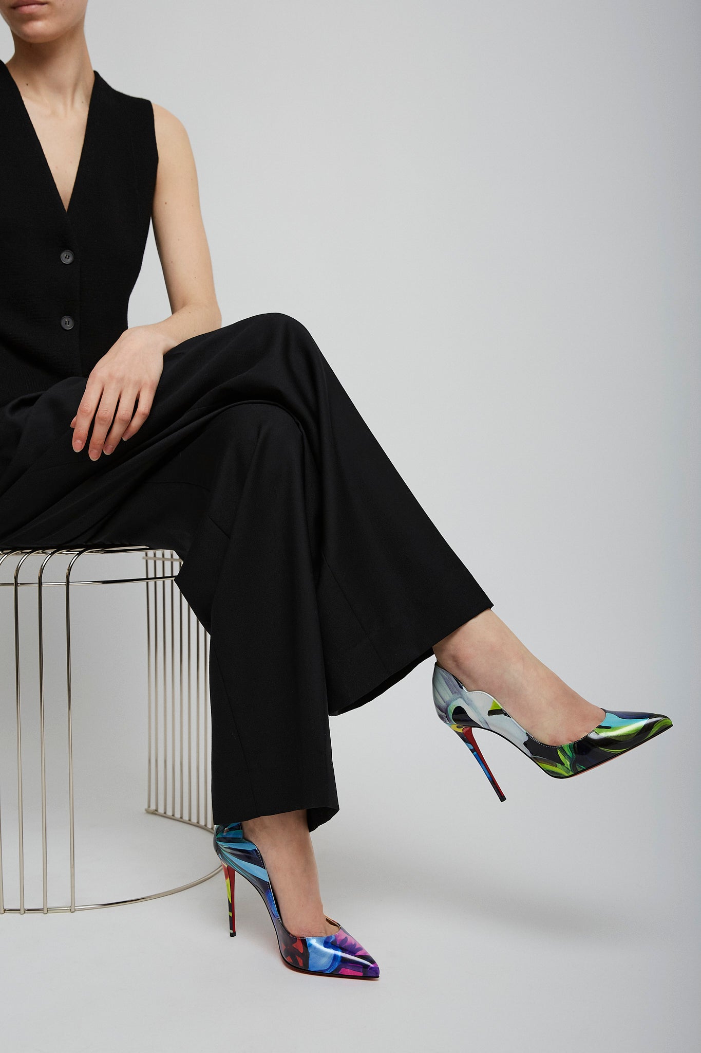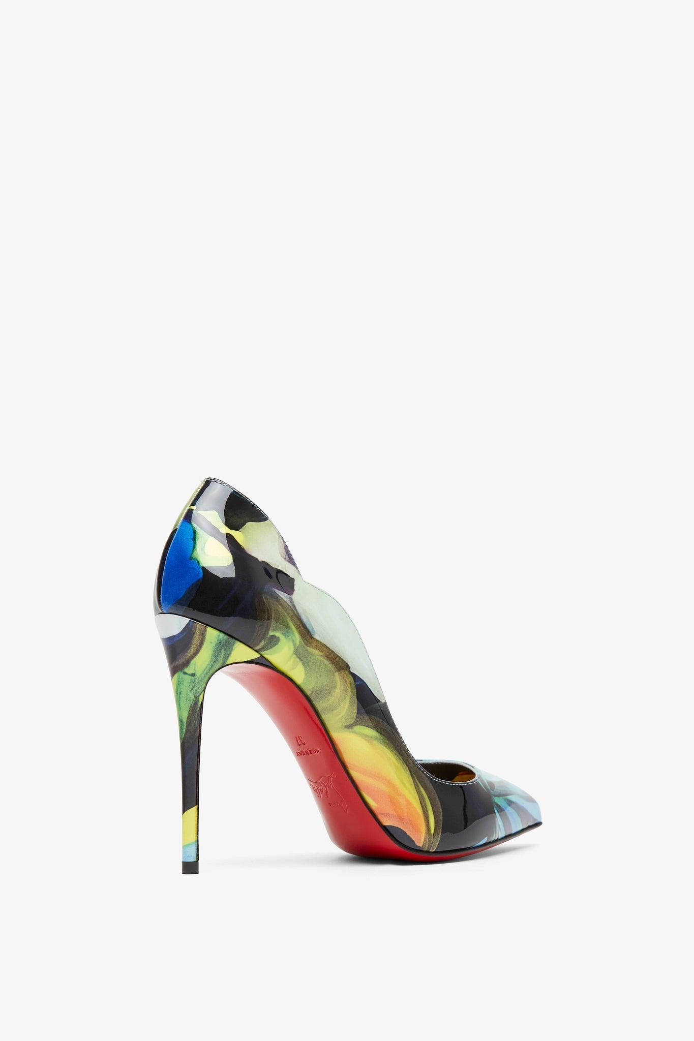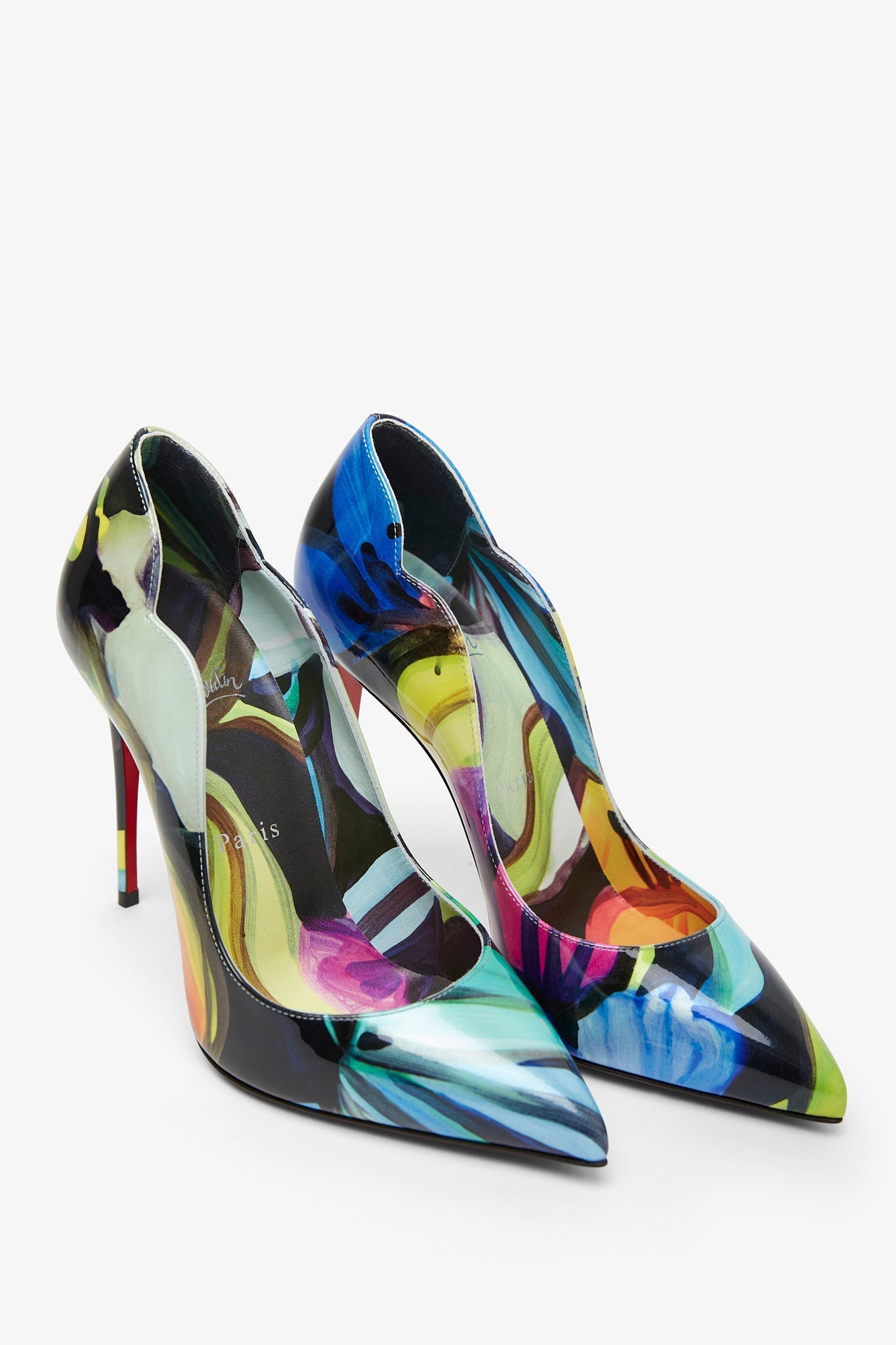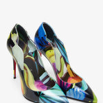 Multicolored patent leather pumps from Christian Louboutin. The Hot Chick pumps are made from pearlescent patent multicolored flower print calf leather with an arch detail at the side, pointed toes and set on a 100mm slim stiletto heel.