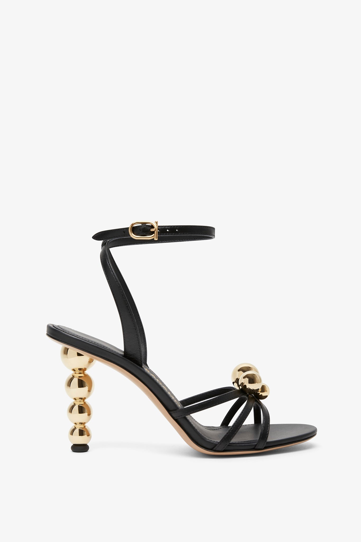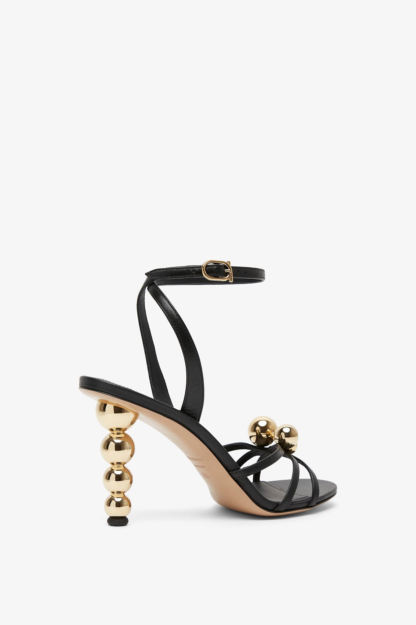 Black leather sandals from Ferragamo. The Karina sandals are made of leather with golden sphere accents, open toes and slim straps that elegantly frame your feet, set on a 95mm gold-tone sphere stiletto heel.