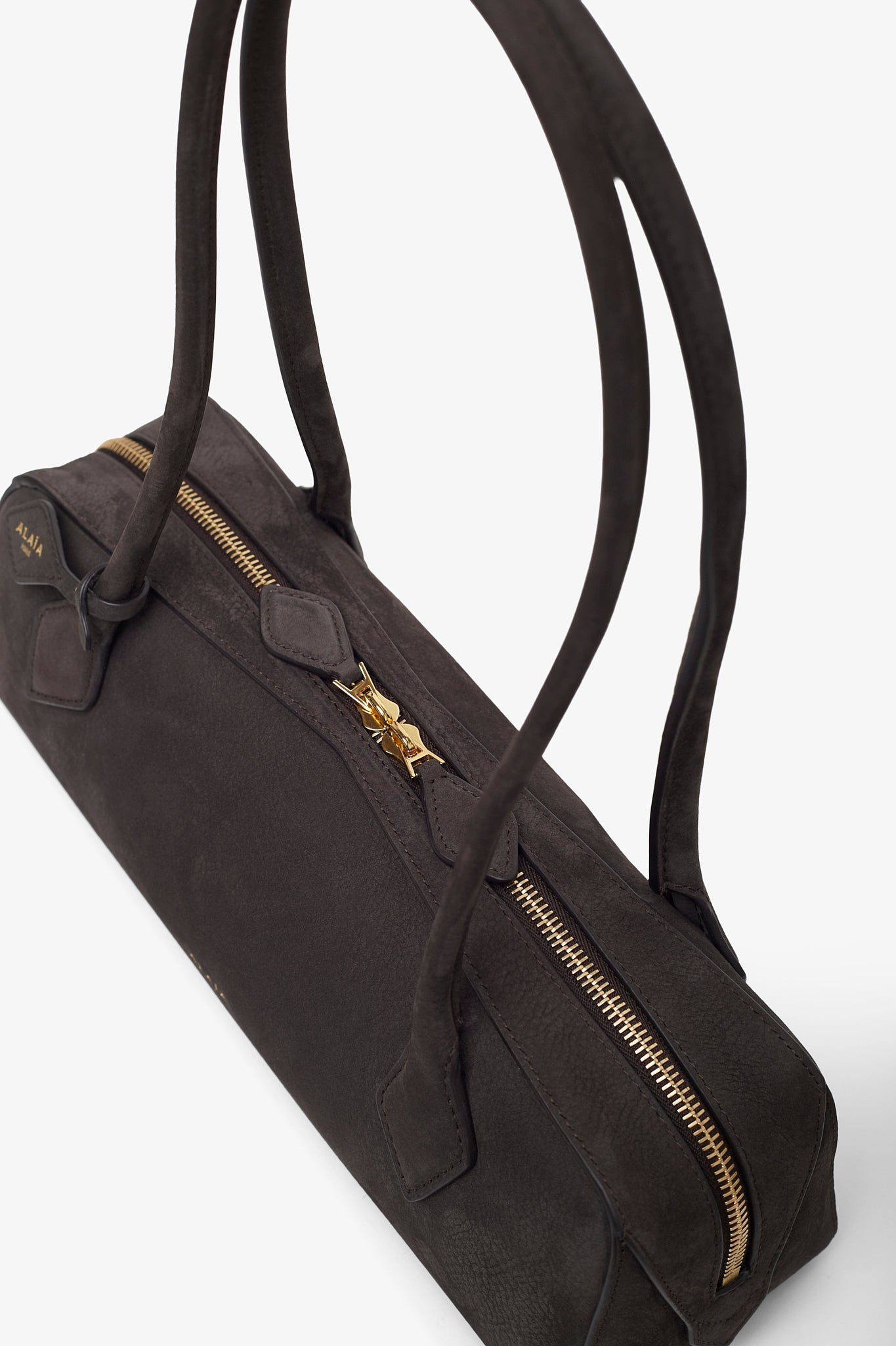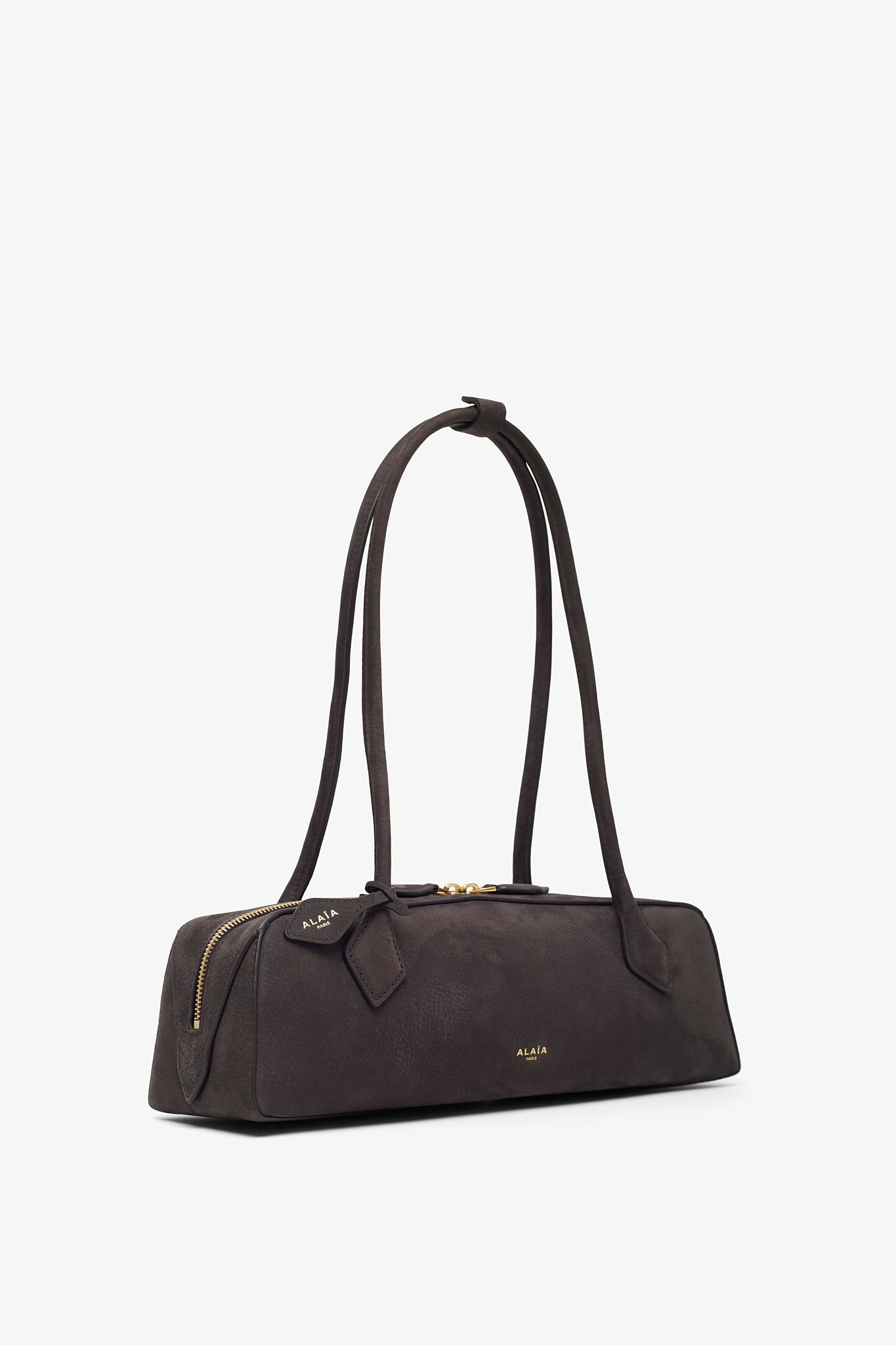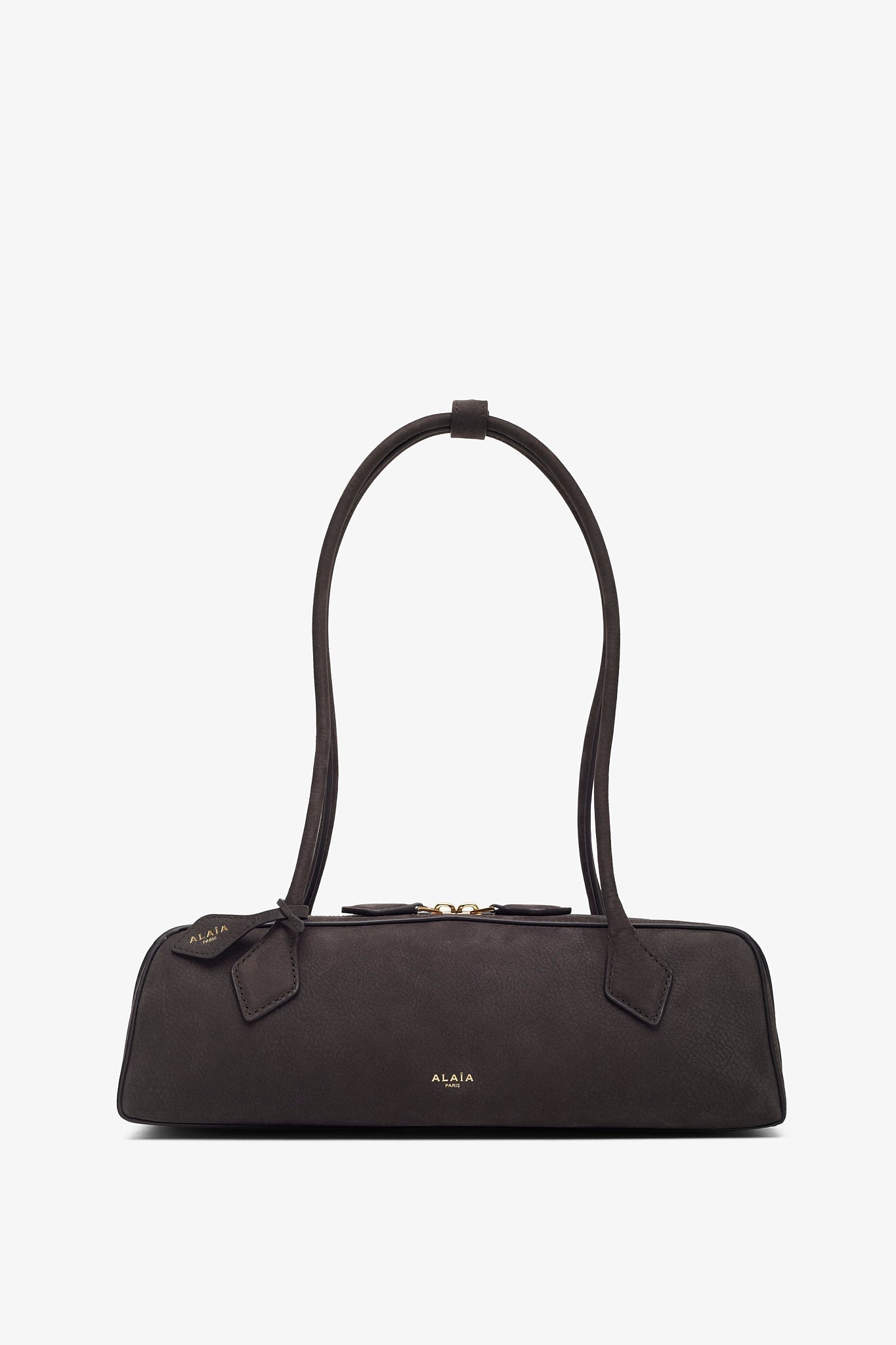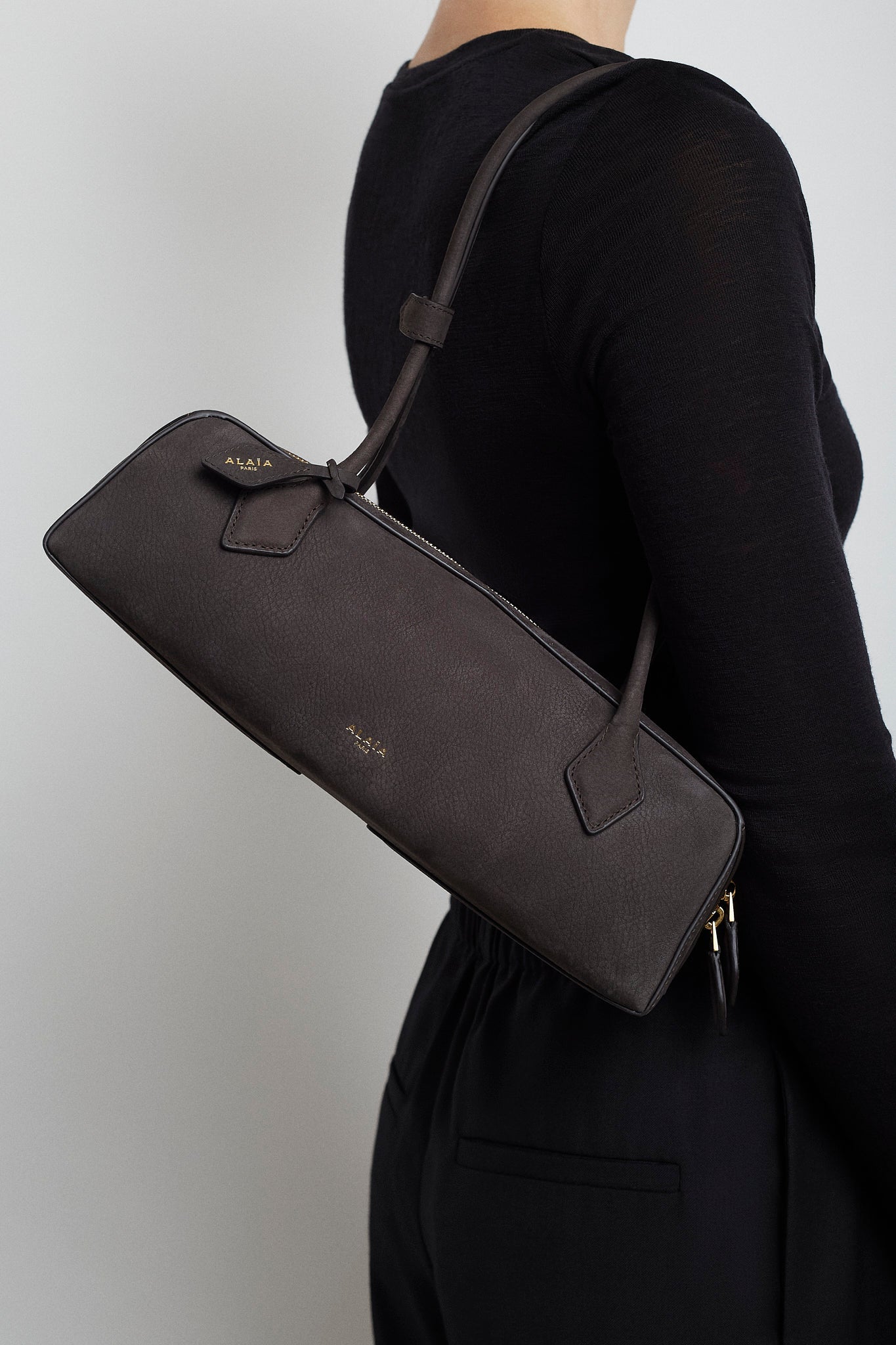 Grey shoulder bag from Alaïa. The Le Teckel bag is made of nubuck suede calf leather with extended shoulder straps, a two-way zip fastening along the top, complete with a slip pocket inside to fit your cards.