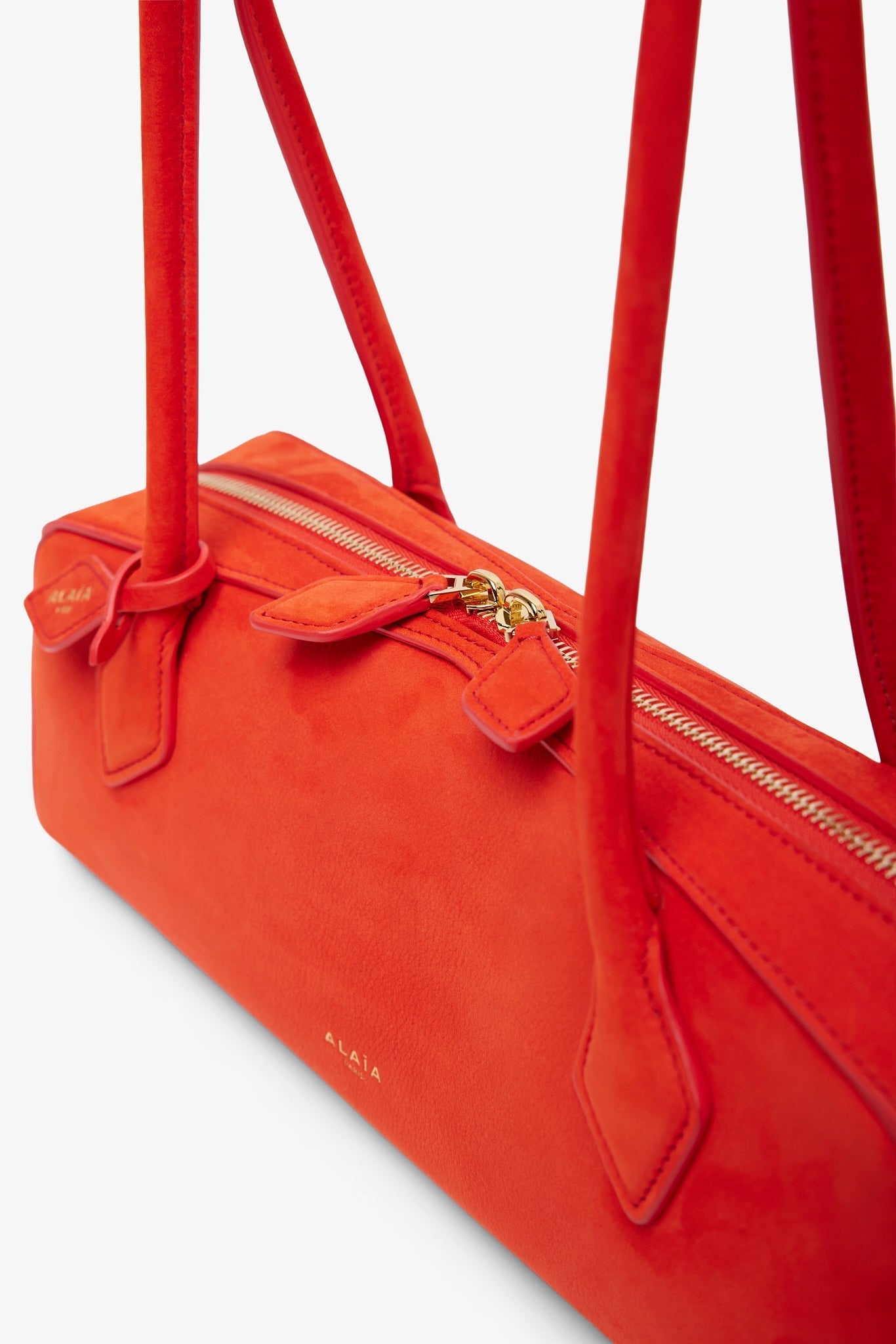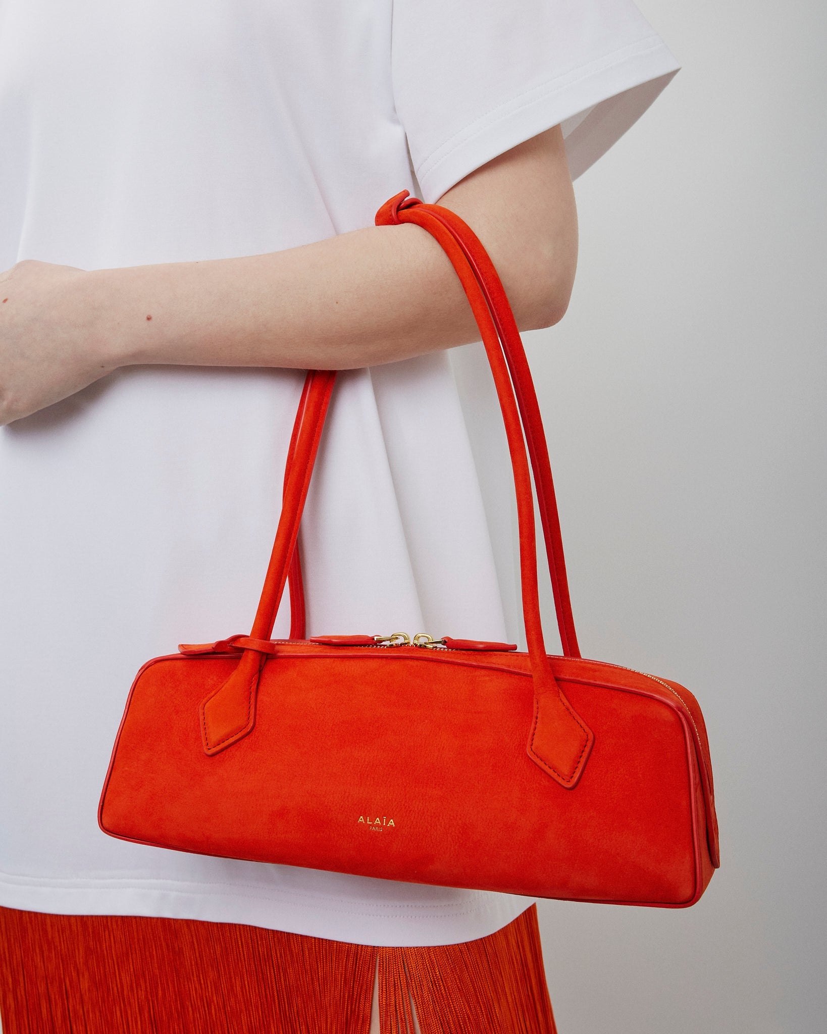 Orange shoulder bag from Alaïa. The Le Teckel bag is made of nubuck suede calf leather with extended shoulder straps, a two-way zip fastening along the top, complete with a slip pocket inside to fit you cards.