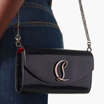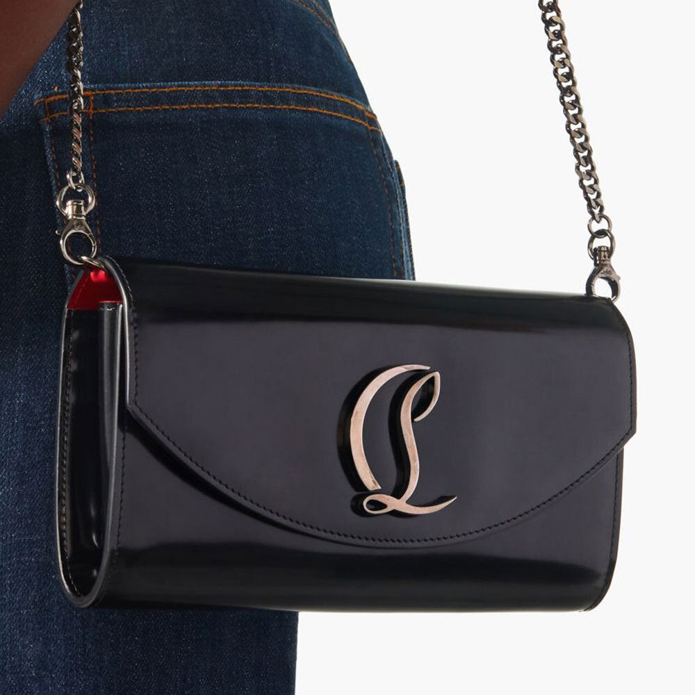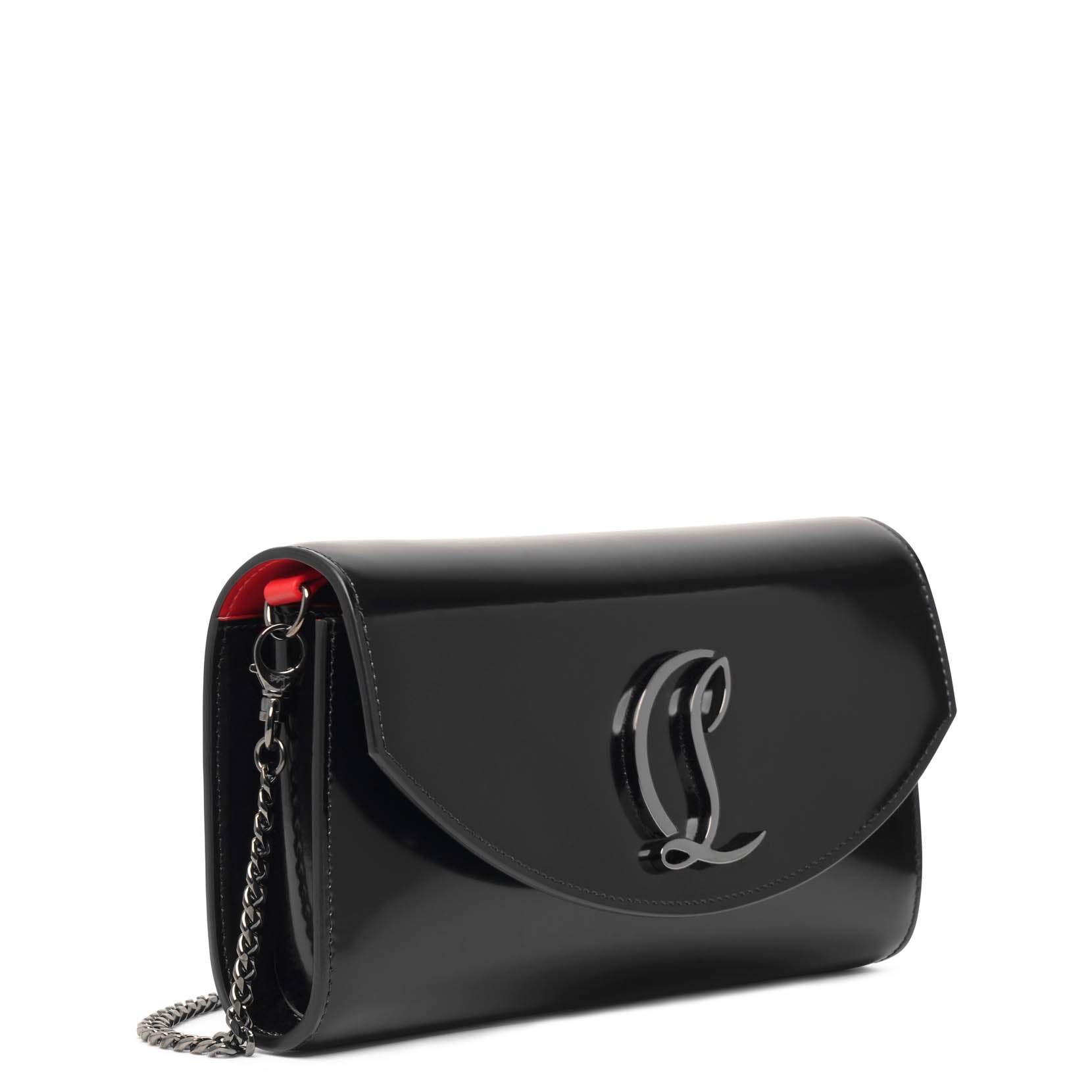 Black patent leather wallet on chain bag from Christian Louboutin. The Loubi54 wallet is made of black abrasivato leather and is adorned with a black CL monogram. It can be carried by hand or over the shoulder with the detachable leather-reinforced chain strap.