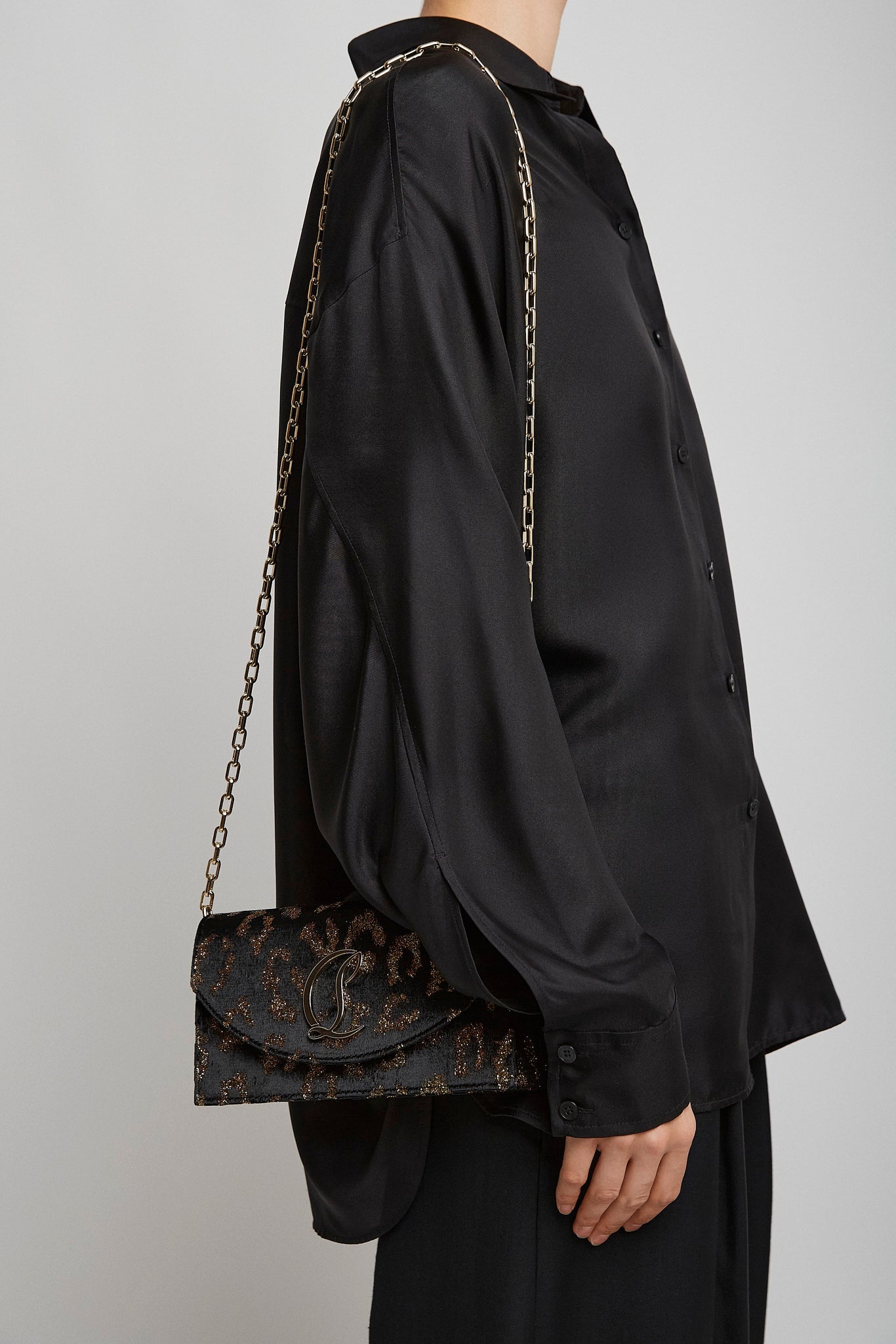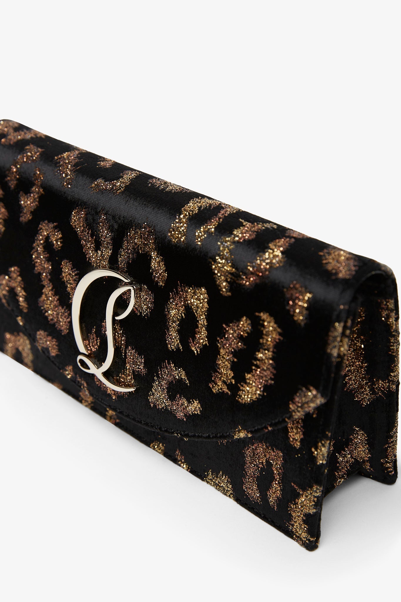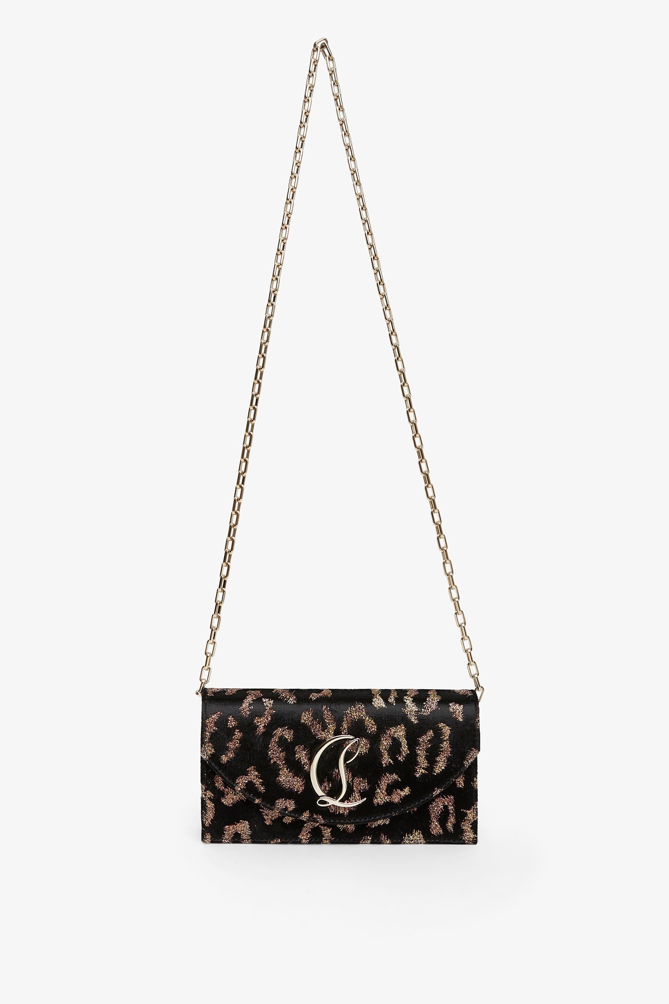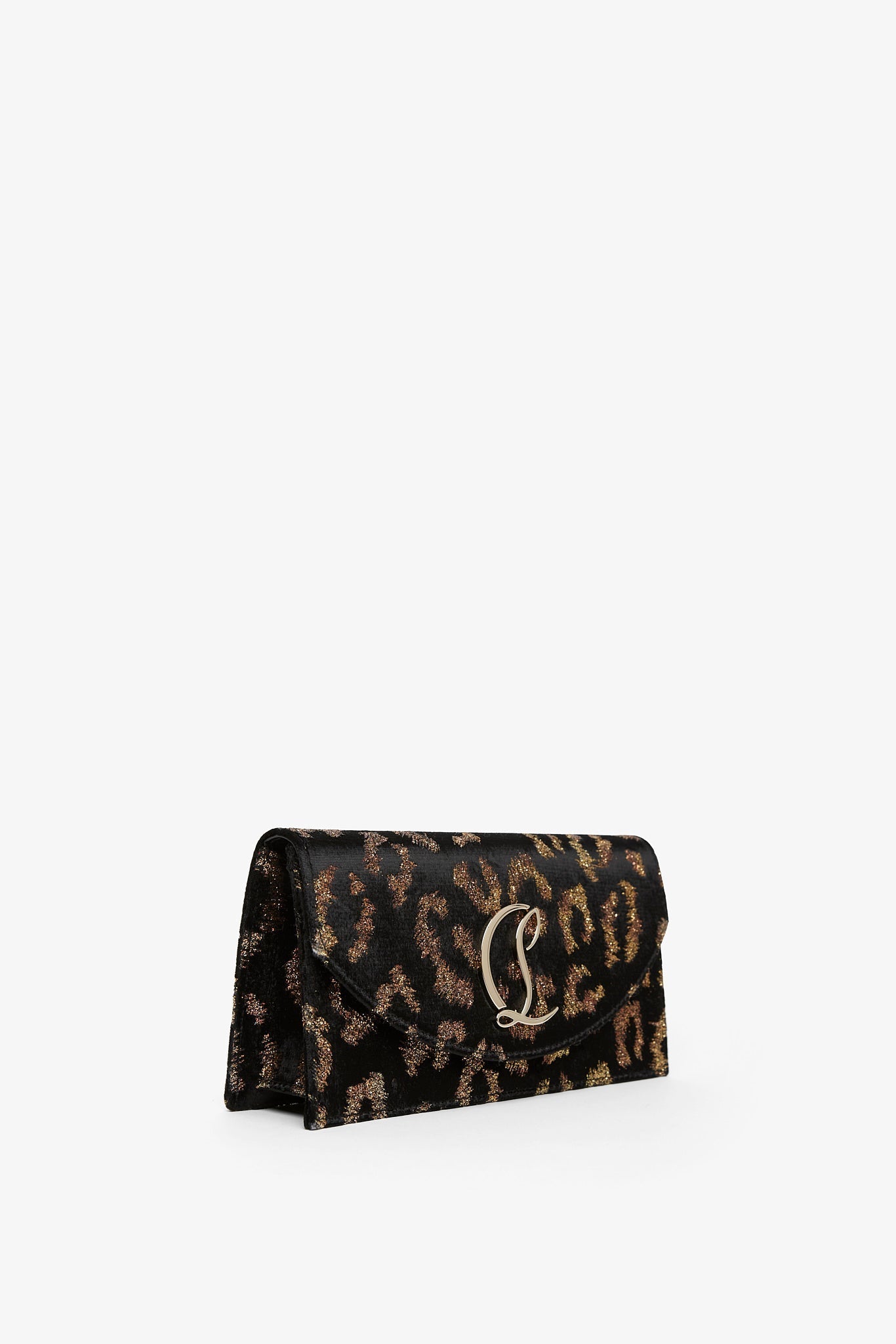 Leopard velvet clutch bag from Christian Louboutin. The Loubi54 clutch bag has a gold-toned CL Logo monogram buckle on the front flap, snap closure and card slot inside. It comes with a detachable strap to be worn either over the shoulder, or in hand.