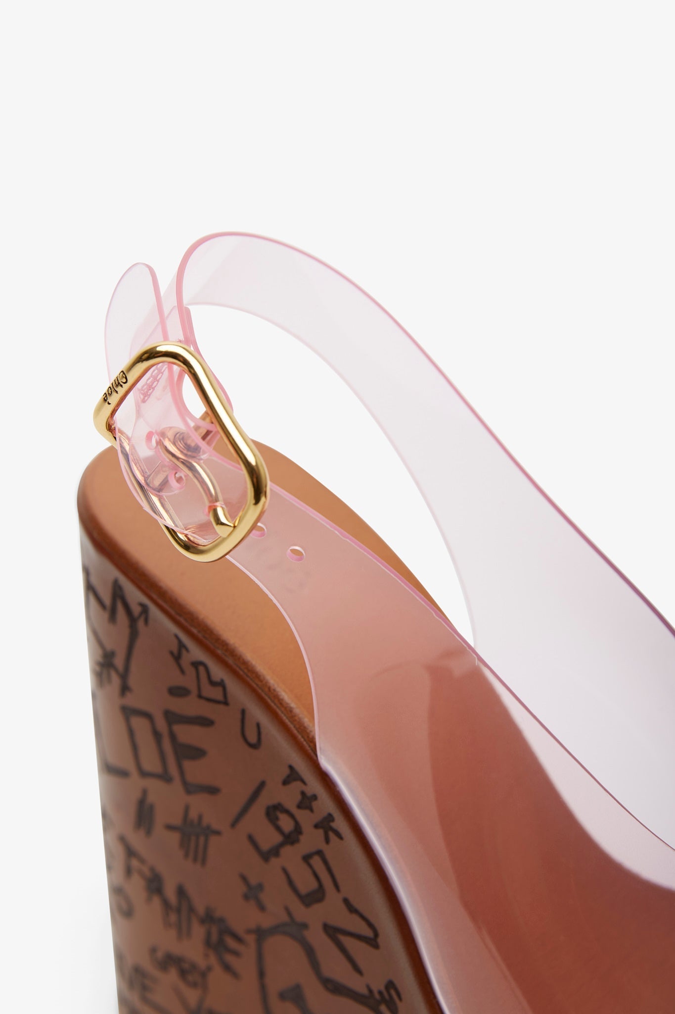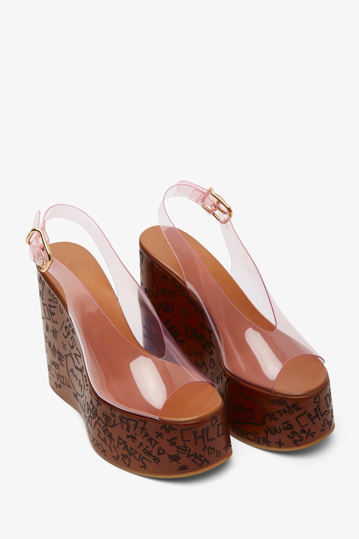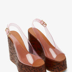 Pink platform wedge sandals from Chloé. The Maxime sandals are made in transparent TPU and are set on a wood-effect platform with a heel-to-toe drop of 80mm, total heel height is 130mm.