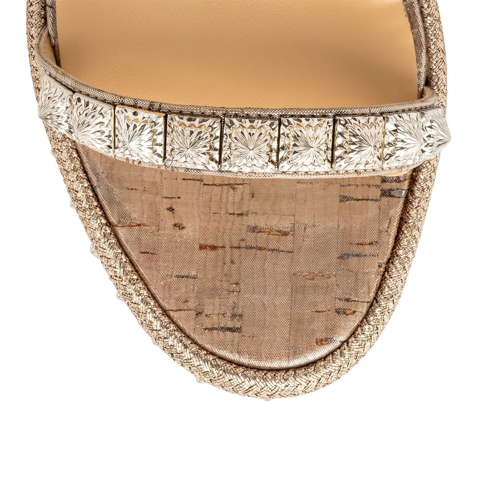 Silver metallic cork wedge sandals from Christian Louboutin. The Pyradiams sandals have a 110mm heel and polished silver tone pyramid stud details, two rows of silver rope trim and a silver tone buckle closure at the side.True to size
