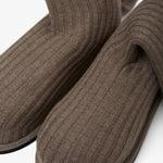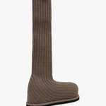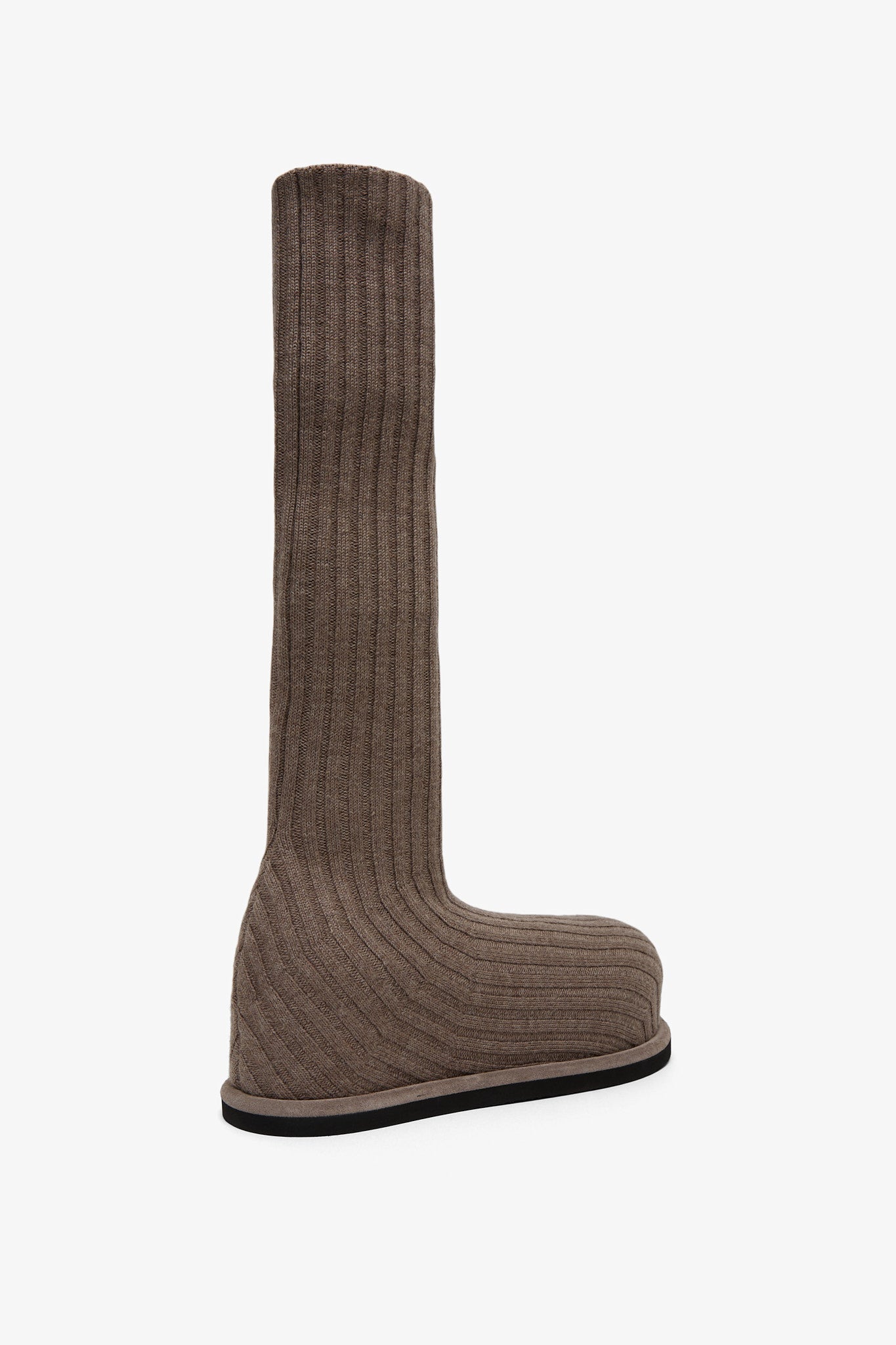 Brown knitted stretch ankle boots from Amina Muaddi. The Veneda platform boots are made of wool with sheepskin lining. It has a rounded toe, fits below the knee and is complete with a 15mm platform.